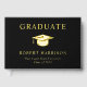 Elegant black graduation party guest book featuring your choice of genuine gold, silver or rose gold foil, a grad cap, "Graduate" and the graduate's name, school and class year in classic serif typography, and their photo on the back.
