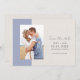 Wedding save the dates in a blue and beige faux linen paper design, perfect for a beach or coastal wedding. Customise with your photo and wedding details, mail to family and friends asking them to reserve your wedding date.