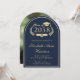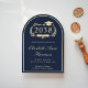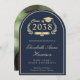 Formal arch-shaped dark blue college graduation announcement featuring "Class of" within a gold illustration of a laurel wreath incorporating a grad cap and diploma, and the graduate's name in an elegant light gold script. Add their school, major, honours or future plans in classic gold serif typography. The grad's photo fills the back of the card.