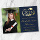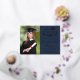 Modern dark blue college graduation announcement featuring real foil, "Class of" in an illustration of laurel wreath incorporating a grad cap topper and diploma, a photo of the graduate and their name in an elegant script. Add their school, major, honors or future plans.