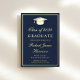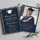 Elegant formal blue college graduation announcement and party invitation featuring real gold foil, a grad cap, the graduate's name and class year in a classic calligraphy script, and their school, major and honours. On the back, add a photo and personalise your party details in gold lettering.