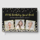Elegant custom birthday guest book design featuring gold and silver confetti over a black background, modern script typography with the words "100th Birthday Guest Book" (in gold foil), your name and date (in silver), and three of your favourite photos framed in gold foil.
