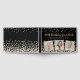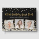 Elegant custom birthday guest book design featuring gold and silver confetti over a black background, modern script typography with the words "100th Birthday Guest Book" (in gold), your name and date (in silver), and three of your favourite photos framed in metallic gold foil. Feel free to contact me if you need help or a custom order.