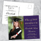 Elegant purple college graduation announcement and party invitation postcard featuring a photo of the graduate, their name and class year in a light gold script and their university, major and honors. On the back, add the grad party details.
