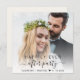 Elegant light cream elopement or small wedding announcement and reception square invitation featuring your wedding day photo and "Happily Ever After Party" in a mix of simple typography and a chic script with swashes, your first names joined by a heart and your wedding or reception date. On the back, personalise your message and add your names in a signature-like script.