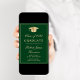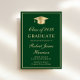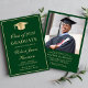 Elegant green college graduation announcement and party invitation featuring a gold grad cap, the graduate's name and class year in a gold script, and their school, major and honours in classic gold typography. On the back, add a photo and personalise your party details.