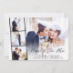 Elegant elopement or private wedding announcement and reception invitation featuring your wedding day photo overlayed with a strip of three smaller square photos and "Happily Ever After" in a stylish modern script. Add your first names, wedding date and location in simple typography. On the reverse side, personalise your marriage announcement and reception invitation and add your names in a signature-like script.
