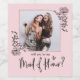 Modern, trendy Maid Of Honour proposal wine bottle labels. Design features single photo inside arch frame with floral elements on a blush pink background, typography script '' will you be my Maid Of Honour''.