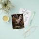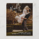 Modern budget wedding program flyer featuring a simple design with your names in an elegant handwritten script at the top left and your wedding details in right alignment at the bottom right, over your favourite photo. The backside has your order of ceremony, wedding party and thank you message in black over a white background. The chic hand lettering adds a romantic touch to this minimalist design. These cheap wedding programs are printed on sheets of paper for a budget friendly option.