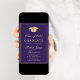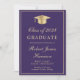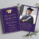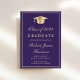 Elegant formal purple college graduation announcement and party invitation featuring a gold grad cap, the graduate's name and class year in a gold calligraphy script, and their school, major and honours in classic gold typography. On the back, add a photo and personalise your party details.