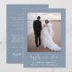 Elegant dusty blue elopement or small wedding announcement and post-wedding reception invitation. The front features your photo, "happily ever after" in a stylish white script with swashes and your names, wedding date and location. On the reverse, personalise your wedding announcement, add a reception or party invitation, input your wedding website address to create a QR code for guests to scan to RSVP online and sign your married names in a signature-like white script.