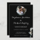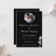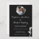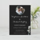 Elegant Flower Wreath Black White Photo Wedding Invitation. Simple and elegant wreath enhanced with couple photo in the centre. White flowers surrounded by a blue wreath on a black background with white text. Display your unique style with this script calligraphy wedding invite. Share your romantic photo with your relatives and friends. Customise with your wedding details.