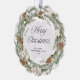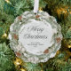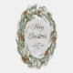 This stunning holiday ornament card features a Christmas wreath with elegant botanical greenery foliage, and pine cones with festive white flowers. Modern script calligraphy says "Merry Christmas," and a subtle, sage green watercolor splash decorates the centre of the wreath. The back has a matching design with room to add a personal message.