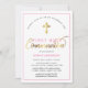 Invite your family and friends to celebrate your daughter's First Holy Communion with these modern elegant invitations. Design featuring pink frame, calligraphy script in gold and gold cross, personalise with celebration details in trendy lettering.