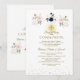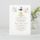 Elegant card design featuring watercolour delicate pink, blue flowers, green and gold leaves, a faux gold cross, faux gold confetti, on a white background. Use Personalize tool to add your info. For matching items, please, visit my Religious Events Collection.