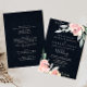 This elegant pink blush floral front and back wedding invitation is perfect for a simple wedding. The design features hand-drawn pink blush roses and peonies with green and grey leaves in a dark blue background, inspiring natural beauty.