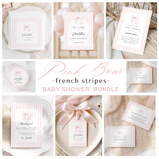 Elegant baby shower stickers that features light pink & white stripes and a simple bow design