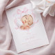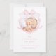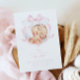 This birth announcement card features a soft and elegant design. The front of the card displays a photo of a newborn baby framed by a delicate watercolor pink ribbon in the shape of a bow. With a pink and white colour scheme, it makes a perfect choice for announcing the arrival of your baby girl.