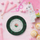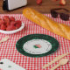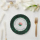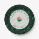 Paper plates featuring graphic-style Pink camellia flower, off white background with a green border, and a floral background. Text is customisable. Look for matching wedding products.