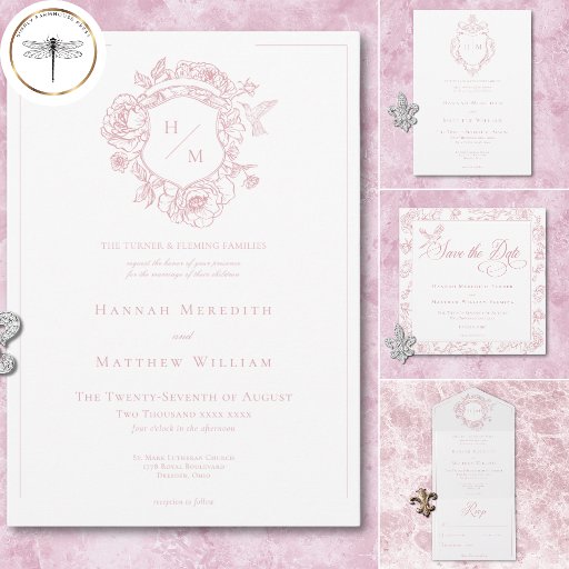 Elegant Pink Chinoiserie Bird Crest Border Wedding Invitation