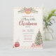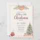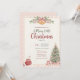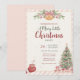 Sophisticated Christmas invitation featuring delicate watercolor bells with a pink satin bow, accented by soft greenery and berries. The gold border frame and pink diagonal stripe background create an upscale, feminine aesthetic. Perfect for elegant holiday soirées, bridal Christmas parties, or refined seasonal gatherings with charm.