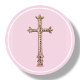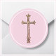 Elegant decorative rose gold tone cross on a pink background with a white border.