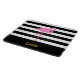 This black and white cutting board can be personalised with your custom text such as your name in faux (not foil) gold script at the bottom. A pink flamingo is above the text. The tropical bird appears on a black and white striped pattern.