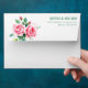 This elegant wedding envelope features a beautifully illustrated pair of pink roses with lush green leaves, creating a romantic and classic theme. The design is set against a crisp white background, enhancing the soft colour palette of pinks and greens. Clean, bold typography presents the names and address in a modern sans-serif font, ensuring clarity and sophistication. Perfect for formal occasions, this envelope combines natural beauty with timeless style, making it an ideal choice for weddings or other special events.
