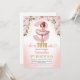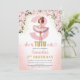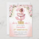 Tutu Ballerina First birthday invitation featuring watercolor cute girl with tutu dress combined light pastel pink roses and gold glitter confetti. A tutu dress and soft pink roses and gold sparkles comes together for a classy birthday invitation that is sure to impress! Excited sentence “She is tutu cute” in elegant script.