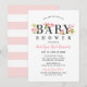 Modern and elegant horizontal baby shower invitation features the title words "Baby Shower" in soft black accented by pretty watercolor pastel pink, blush pink, and peach spring dahlia and rose flowers with spring green foliage. The wording can be completely personalised for your special event. A pattern of white and light pink horizontal stripes dresses up the back of the card.