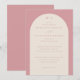 This wedding invitation features an elegant, vertically oriented layout with a soft pink background and a central cream-colored arch framing the text. The design utilizes classic serif fonts in varying sizes to create a harmonious flow, emphasizing key details like the couple's names and event date. Its minimalist approach focuses on typography and simple geometric shapes, conveying a mood of refinement and celebration suitable for a formal occasion. The muted color palette enhances the sophisticated aesthetic, making it perfect for couples seeking a timeless and graceful invitation design.