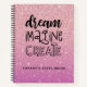 This personalised girly 8.5 x 11 sketchbook has black typography on a pink ombre glitter background. The words, "DREAM, IMAGINE, CREATE" in a hand drawn font personalised with your name below. Customise the sketchbook with the name of your choice to make someone feel extra special. Makes a fun gift for birthdays or for Christmas. Comes in a variety of colours. Designed for you by Blackberry Boulevard.
