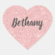 A girly heart shaped sticker with a blush pink faux glitter background. Personalise them stickers with your name. Designed for you by Blackberry Boulevard.
