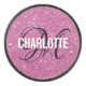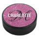Modern monogrammed puck with a white name and a black script monogram on a pink glitter background. Personalise with name and initial.