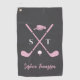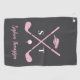 Looking for a stylish personalized golf towel for women that doesn’t get lost or look boring? This chic towel features bright pink golf clubs with white bows, a matching golf hat, and a crisp white golf ball on an elegant gray background. Customize it with initials and a full name for a polished, personal touch.