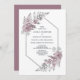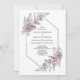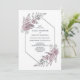 An elegant pink and grey wedding invitation featuring fern leaves and daisies held by a simple faux glitter wireframe. Both the ceremony and reception locations are included in the invitation.