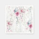 Elegant wedding napkins depict a beautiful spring and summer floral watercolor with pink flowers, grey flowing leaves and white doves.