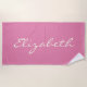 This custom beach towel features your name in beautiful handwritten script lettering on a stylish pink background. Great gift idea.