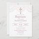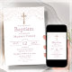 Invite your family and friends to celebrate a special moment with our beautiful baptism invitation. The elegant lace print and gold effect crucifix on a clean white background, paired with the stylish dusty pink lettering and reverse, exude a sophisticated charm. This charming invitation is ready for easy personalisation, so you can add your own unique touch and make this event truly memorable. What's more, with the option to instantly download, you can get them sent out in no time. Let this invitation set the tone for a blessed and unforgettable baptism celebration.