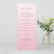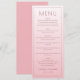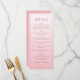 This elegant wedding menu features a soft pink background with centred, serif typography that creates a sophisticated and inviting atmosphere. The layout is clean and minimalist, divided into sections for starters, salad, main course, and dessert, each clearly labelled in a refined typeface. Ample spacing between items enhances readability while maintaining an overall formal appearance. Perfect for a chic event, the design balances simplicity with elegance, making it ideal for couples seeking a classic yet modern aesthetic for their special day.