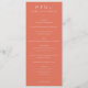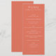 This elegant wedding menu features a warm salmon pink background with a clean, organised layout that highlights each course in a sophisticated serif font. The design is minimalistic yet refined, using black text for high contrast and readability against the soft backdrop. Perfect for formal events, it conveys an atmosphere of anticipation and celebration with its classic typography and orderly arrangement. Customisable elements allow for personalisation, making it ideal for special occasions like weddings.