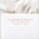 This elegant label features a minimalist design with clean lines and ample white space, creating a modern and sophisticated look. The muted pink hue adds a soft touch to the overall aesthetic, while the serif font enhances the formal feel of the layout. Perfect for weddings or significant announcements, this customizable label offers a refined way to present personal details with understated elegance.