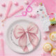 This item is a timeless and elegant design featuring a soft pink color palette and a delicate bow as its centerpiece. Accented with pearlescent details, it exudes grace and sophistication, making it perfect for a chic and heartfelt celebration to baby shower. Matching items available.
