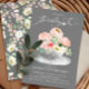 Beautiful pink floral bouquet in a grey tea cup set on a grey background for a birthday tea party. Flip our invite over to view a coordinating floral back for an extra special touch.