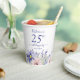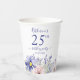 These elegant watercolor floral 25th birthday party paper cups feature pretty summer flowers in pink and purple daisies and roses with a name and date to personalise in modern script. Designed by Susan Coffey.