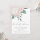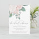 A beautiful modern bridal shower invitation, featuring a top corner bouquet of pink and white watercolor roses with green leaves, on a white background, offset with modern grey font. "bridal shower" is in modern calligraphy font.The reverse of the card is in solid blush pink.