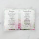 This beautiful program is designed to give your guests all the information they need to follow along with your ceremony, and to acknowledge and thank the performers and members of your wedding party. The elegant design features beautiful bouquets of pink roses and peony buds on a marbled pale teal background.
