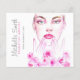 Elevate your beauty salon's branding with this stunning design. Featuring an elegant watercolor illustration of a sophisticated woman with striking green eyes, bold lips, and delicate hands surrounded by vibrant pink roses, this design exudes femininity and luxury. Perfect for beauticians, makeup artists, and salon owners, the card is ideal for showcasing your professionalism and artistry.