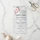 This gorgeous wedding program features a pink and silver theme. There is a beautiful pink floral bouquet in the top corner, with a second smaller rose bouquet on the back at the bottom of the card. All on a metallic silver/grey background.
