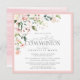 Modern, elegant square First Holy Communion invitation featuring a floral bouquet of soft, watercolor roses in shades of blush pink, peach, and white, with lush green botanical leaves in shades of love and eucalyptus, and bordered in pink. Personalise the details in soft off-black, accented with beautiful modern hand lettered calligraphy. The back of the card features a beautiful pink watercolor texture. Copyright Elegant Invites, all rights reserved.